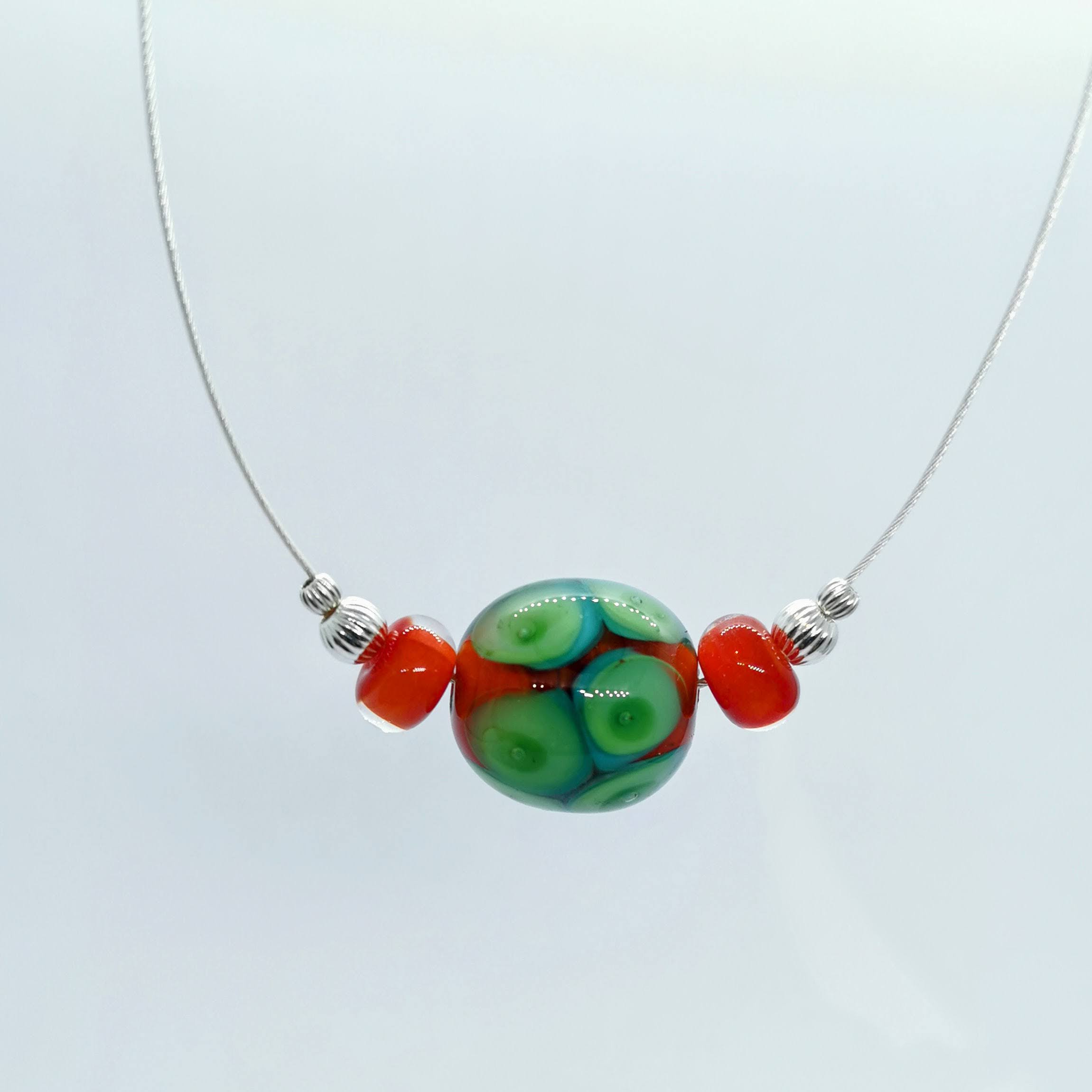 Ici une perle tricolore entourée de perles en argent massif le tout sur un câble argent massif.